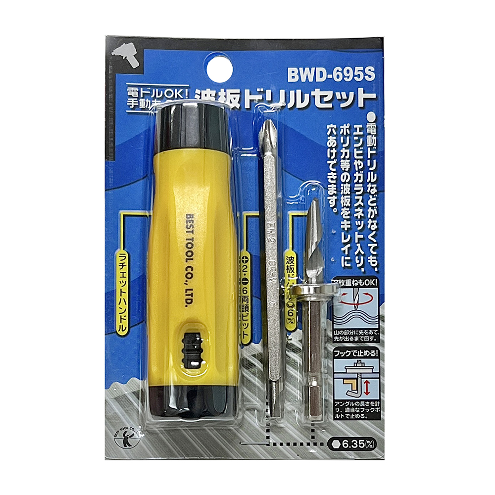 塩ビ・ポリカ・ガラスネット入りなどの波板を綺麗に素早く穴あけ出来る波板ドリルと、手動でも対応出来るラチェットハンドルがセットになっています。