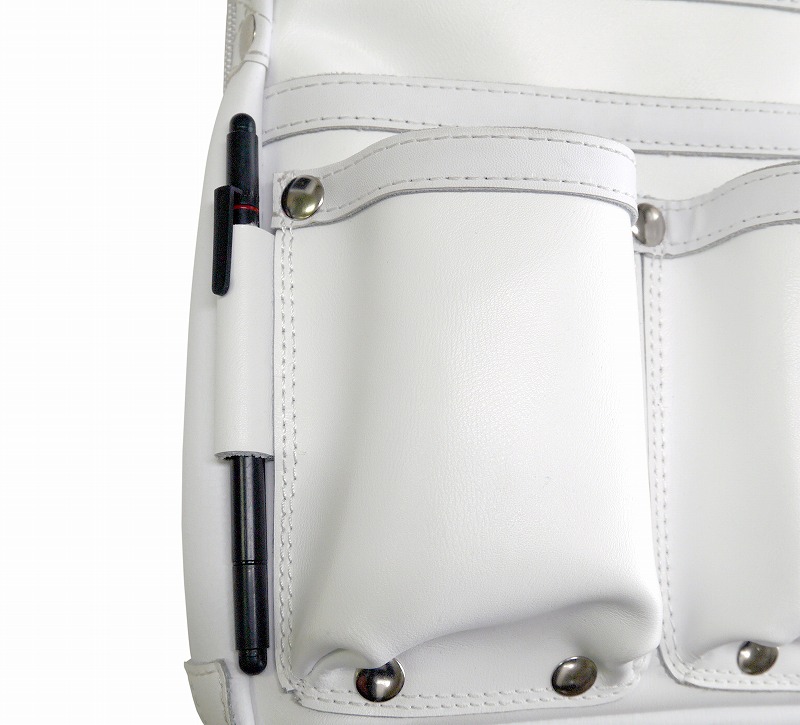前面は白染めした牛革と合皮を使用し、背面は型崩れしにくい三層のPE材を使用。摩擦に強く軽量なため、丈夫かつ機能的な釘袋となっています。