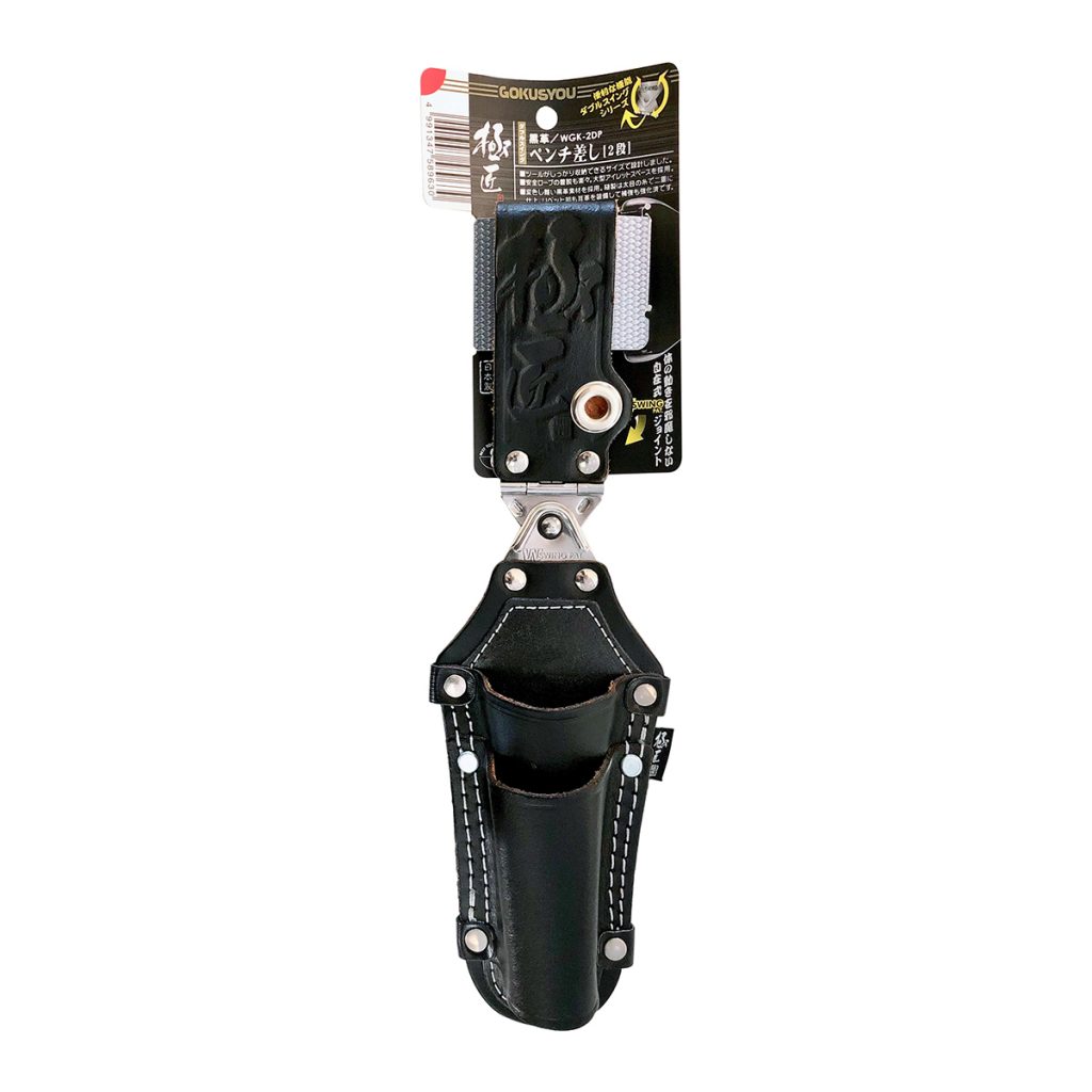 150~200mmまでのペンチやニッパー等を収納できるダブルスイング式黒革工具差しです。