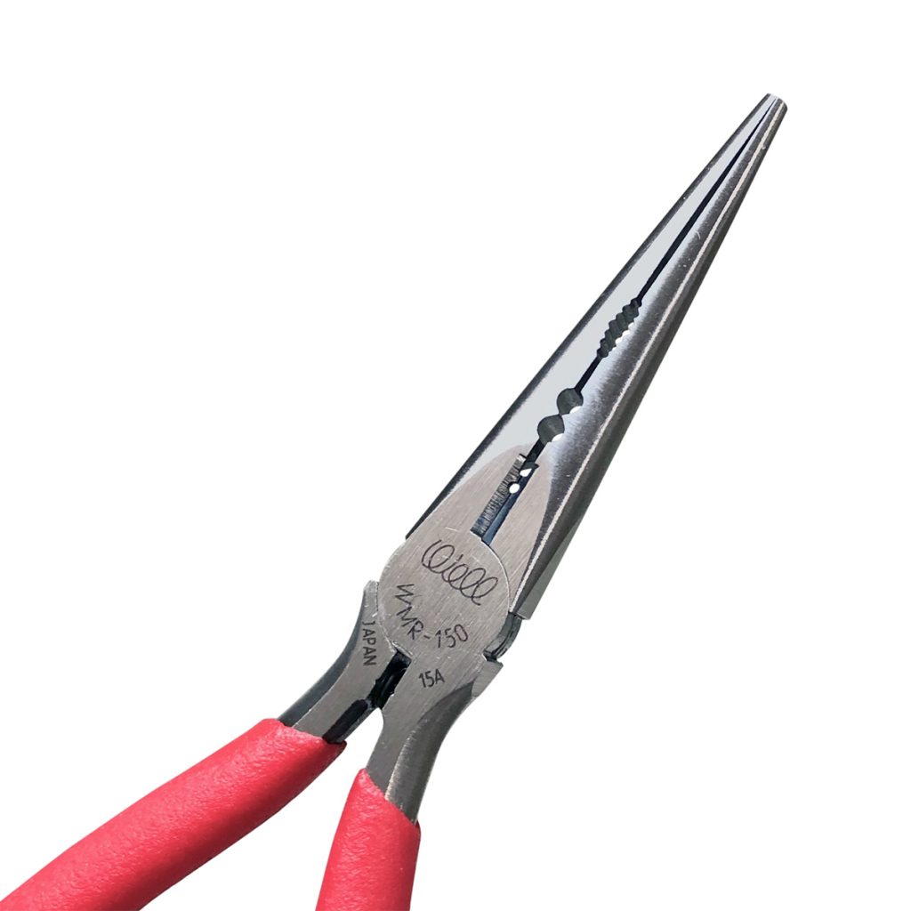 針のように細いニードルノーズと例えられるほど、先端を細長く仕上げてありますので、極端に狭い部分での作業に威力を発揮する工具です。